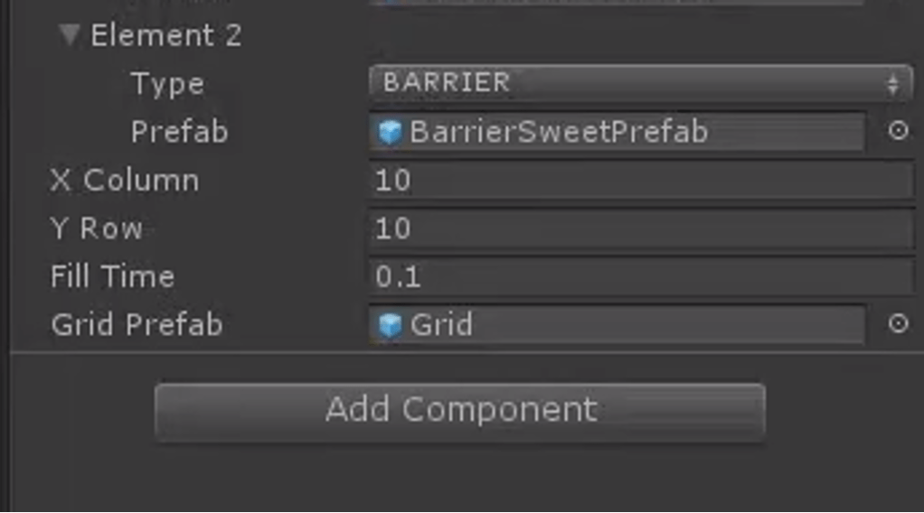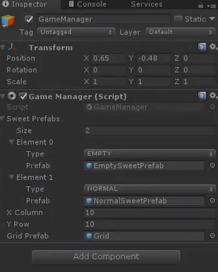 Then, we call this method, at which point empty blocks will fill the screen. We then pass a few parameters into this method and click ‘run’ once the game interface is filled. Below in Unity, set the properties as follows: Add a second element ‘element0’ in the gameManager, whose type is EMPTY, with properties (including dimensions) as shown in the diagram below: