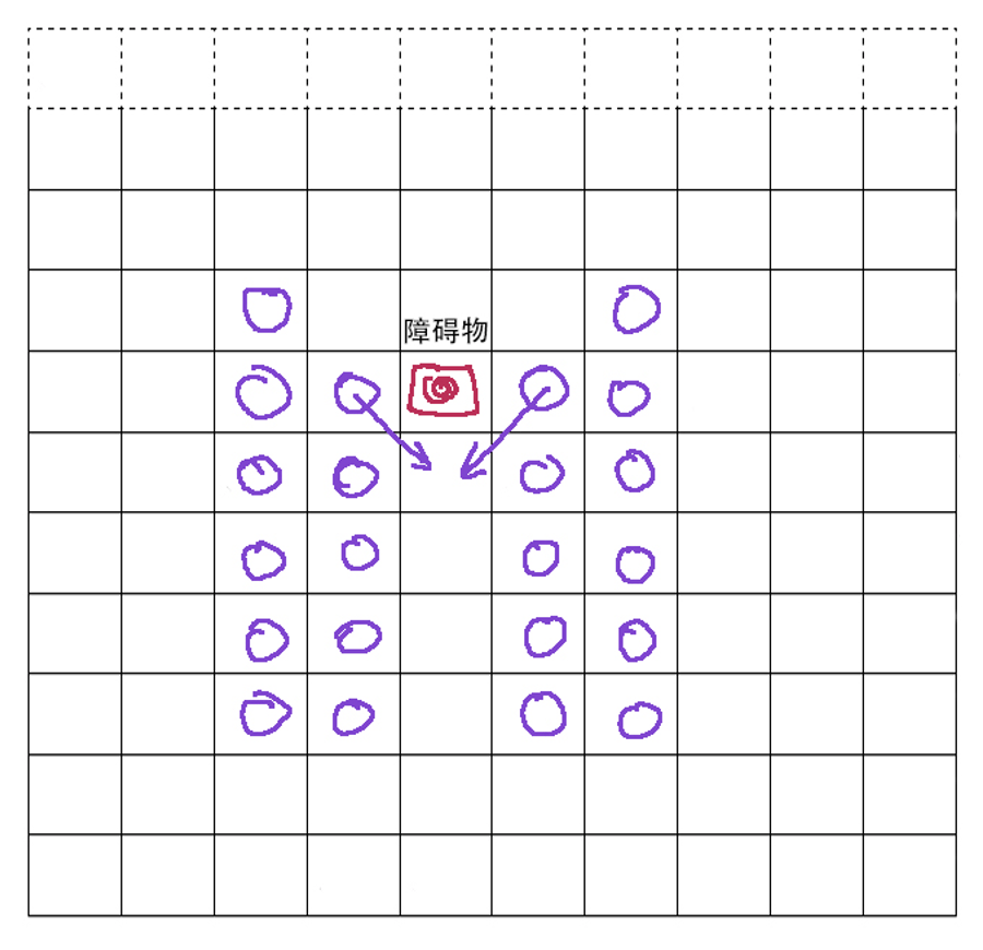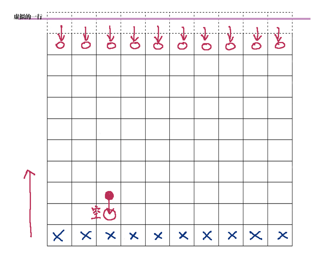 Currently, without many complex types, we classify them into two types: empty sprites and non-empty sprites. If it is a non-empty sprite, meaning it can move, then the next step is to traverse the position directly below it. If it is an empty sprite, then the ordinary non-empty sprites should sequentially move down. At this point, its original position becomes empty, and then we generate a new dessert there. This method continues with sequential traversal, moving down, and filling—this forms the core idea of our core algorithm. For the topmost row, which is special because if it is empty, we cannot fill it as there is nothing above to fill from. At this point, an idea arises: we create a hypothetical row (represented by a dashed line in the diagram), which is at the very top. We let it generate elements each time we finish editing, and when we traverse to the lowest row, we first check if the current cell is empty, if it is, then the row directly above should fill downwards.