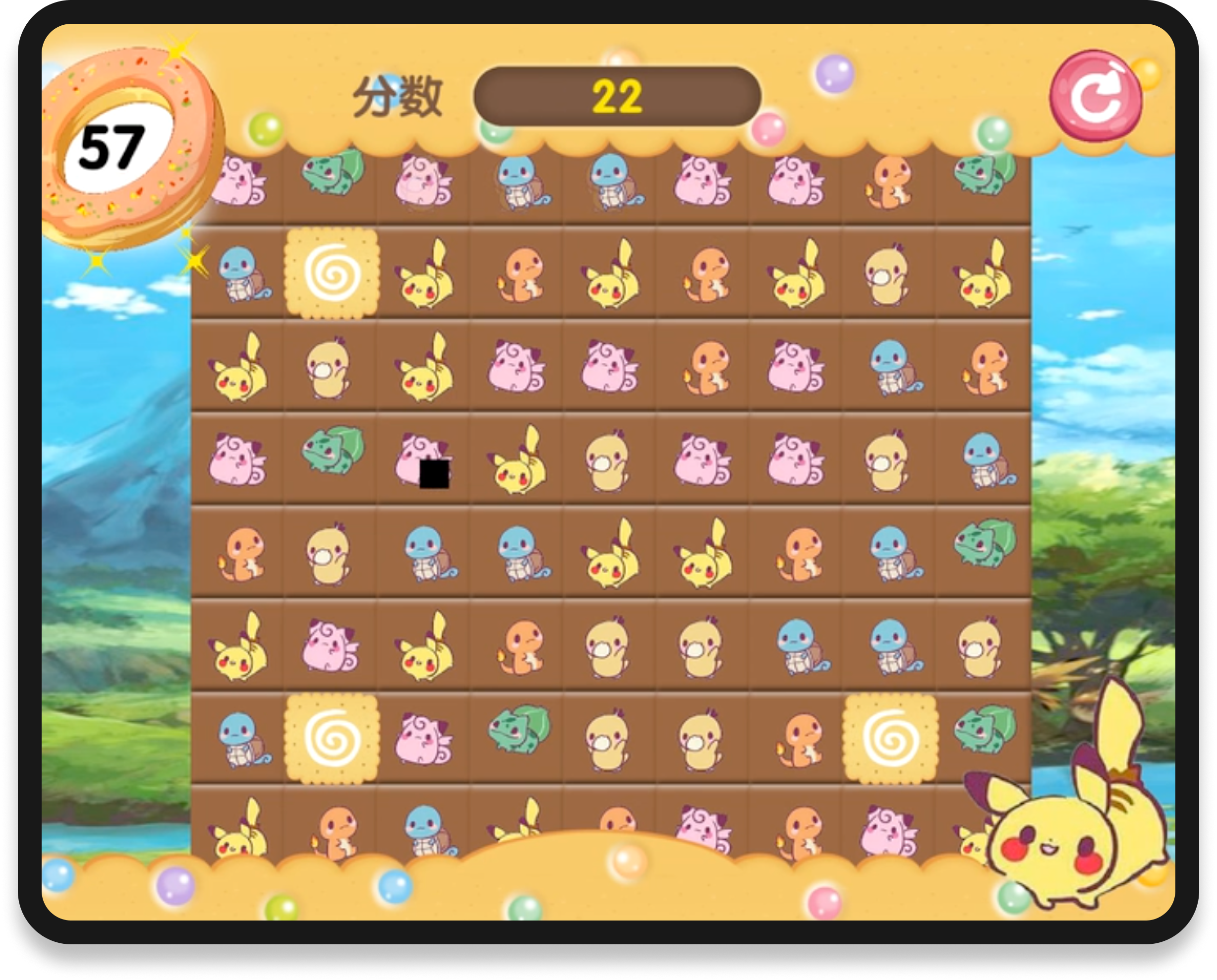 It is a tile-matching game using Unity3D and C#. It covers most of the basic features of this genre. The gameplay is similar to other popular match-3 games: players match three identical items (in this game, Pokémon Assets) in a straight line to eliminate them.